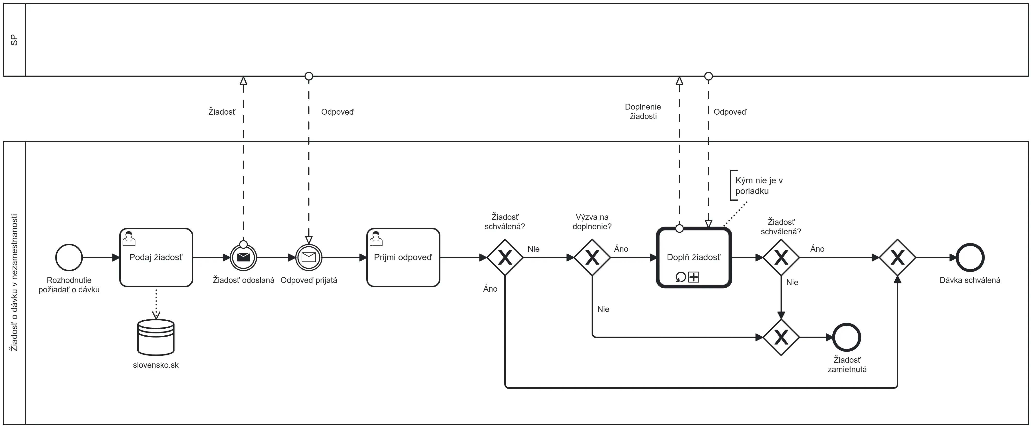 - Ak je potrebné, Camunda spustí ďalší podproces (podanie žiadosti o dávku) a začne komunikáciu so sociálnou poisťovňou.